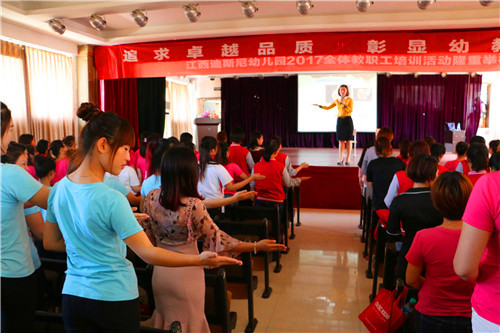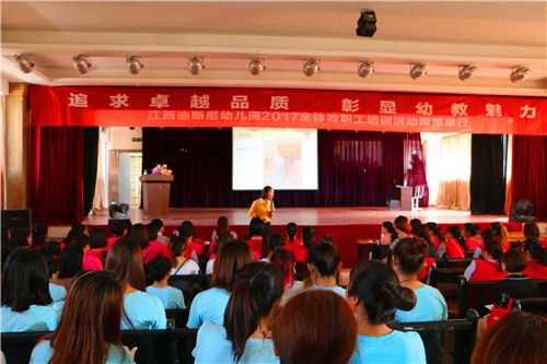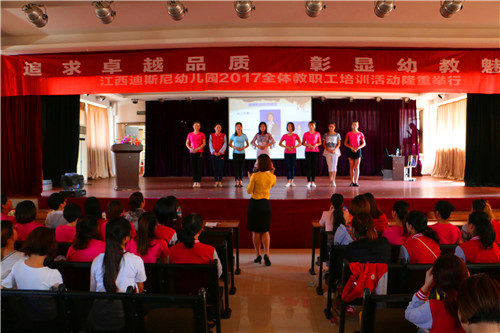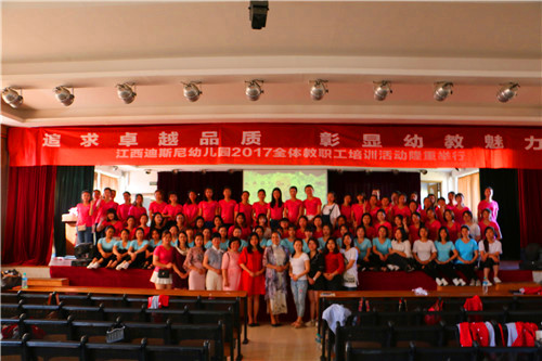 為了加強教師技能,加強教師間的溝通與交流,增進同事感情,增強團隊凝聚力,5月13日,江西迪斯尼·幼兒園2017年全體教師培訓活動在江西工商職業技術學院大禮堂順利舉行,迪斯尼幼兒園六個園所全體教職工近兩百人參加此次活動。